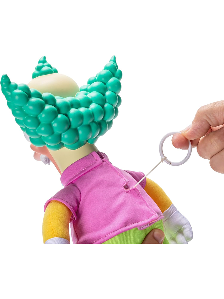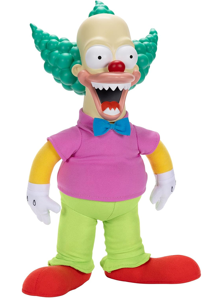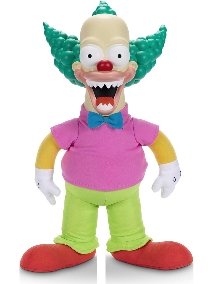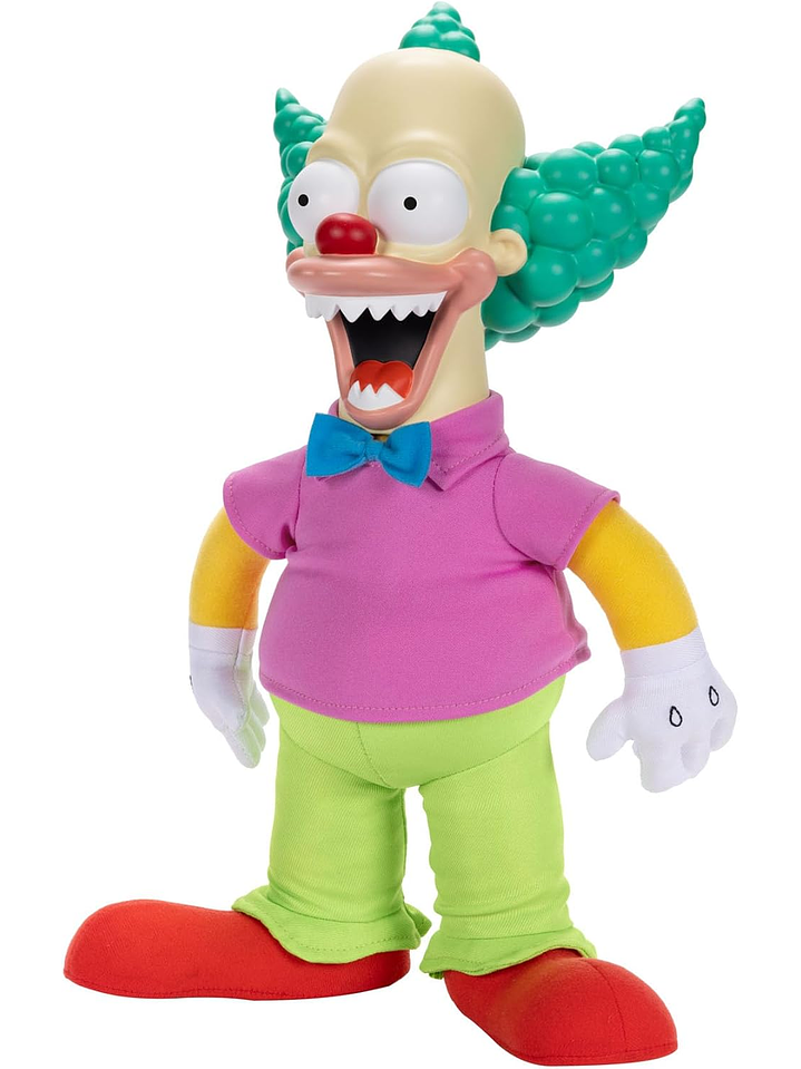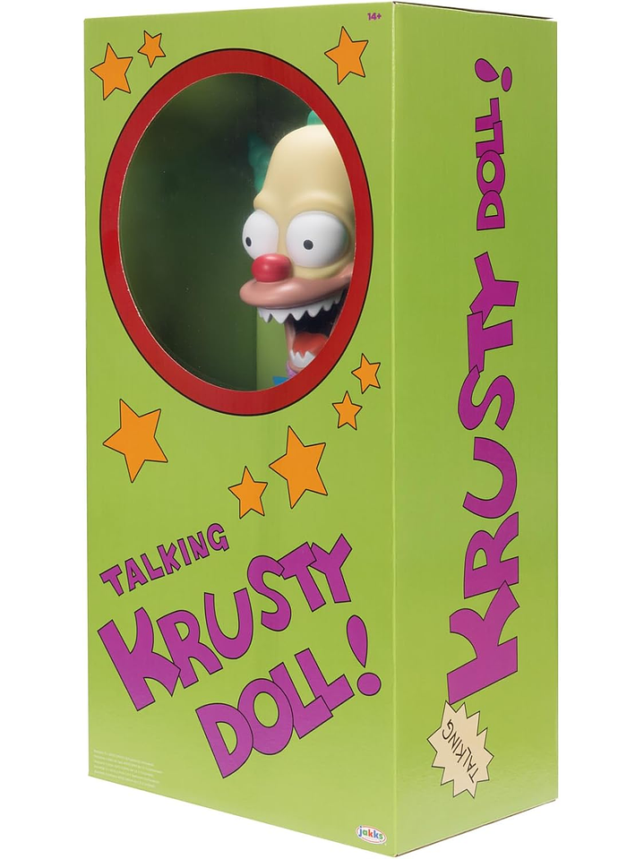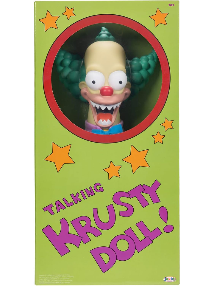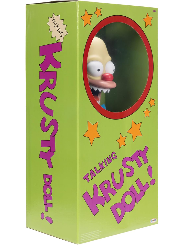 Inspirados en la icónica serie animada Los Simpson, vienen los juguetes y coleccionables con licencia oficial de JAKKS Pacific. Con una altura de 18 pulgadas, Talking Krusty Doll está hecho con un cuerpo suave y una cabeza esculpida detalladamente y está inspirado en su apariencia en el segmento Treehouse of Horror III: Clown Without Pity.
