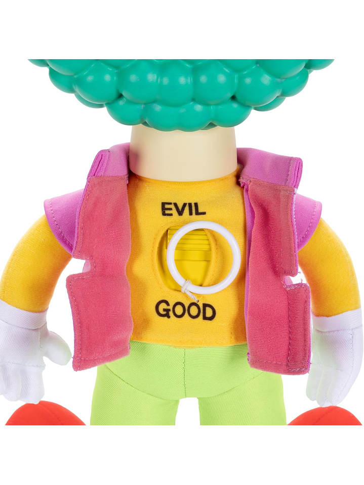 Krusty presenta dos modos de juego y se activa con un interruptor del Bien/Mal en su espalda. Incluye una función de tirar de una cuerda con frases clásicas, tanto buenas como malas, según el modo seleccionado. Viene en su clásico embalaje original y es un gran regalo para cualquier cumpleaños u ocasión. Perfecta para fanáticos y coleccionistas, Talking Krusty Doll tiene detalles notables y características divertidas y atractivas.